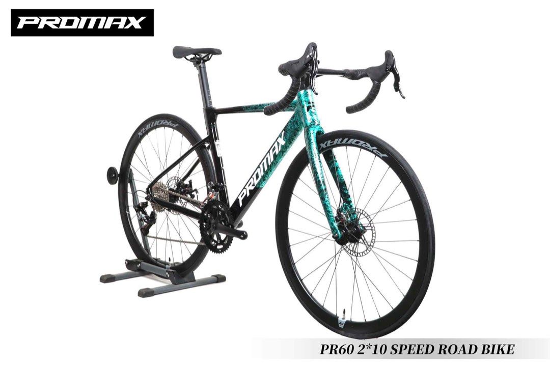 The PROMAX PR60 is a sleek and high-performance road bike designed for riders seeking speed, control, and durability. Featuring an internal cabling aluminum frame with smooth welding, the PR60 combines lightweight strength with a clean, modern aesthetic. Equipped with LTWOO R7 2x10-speed shifters, a mechanical disc braking system, and double-wall aluminum rims, this bike offers precision handling and a comfortable ride, making it perfect for both casual riders and serious cyclists. Available in sizes 44, 46, and 48.